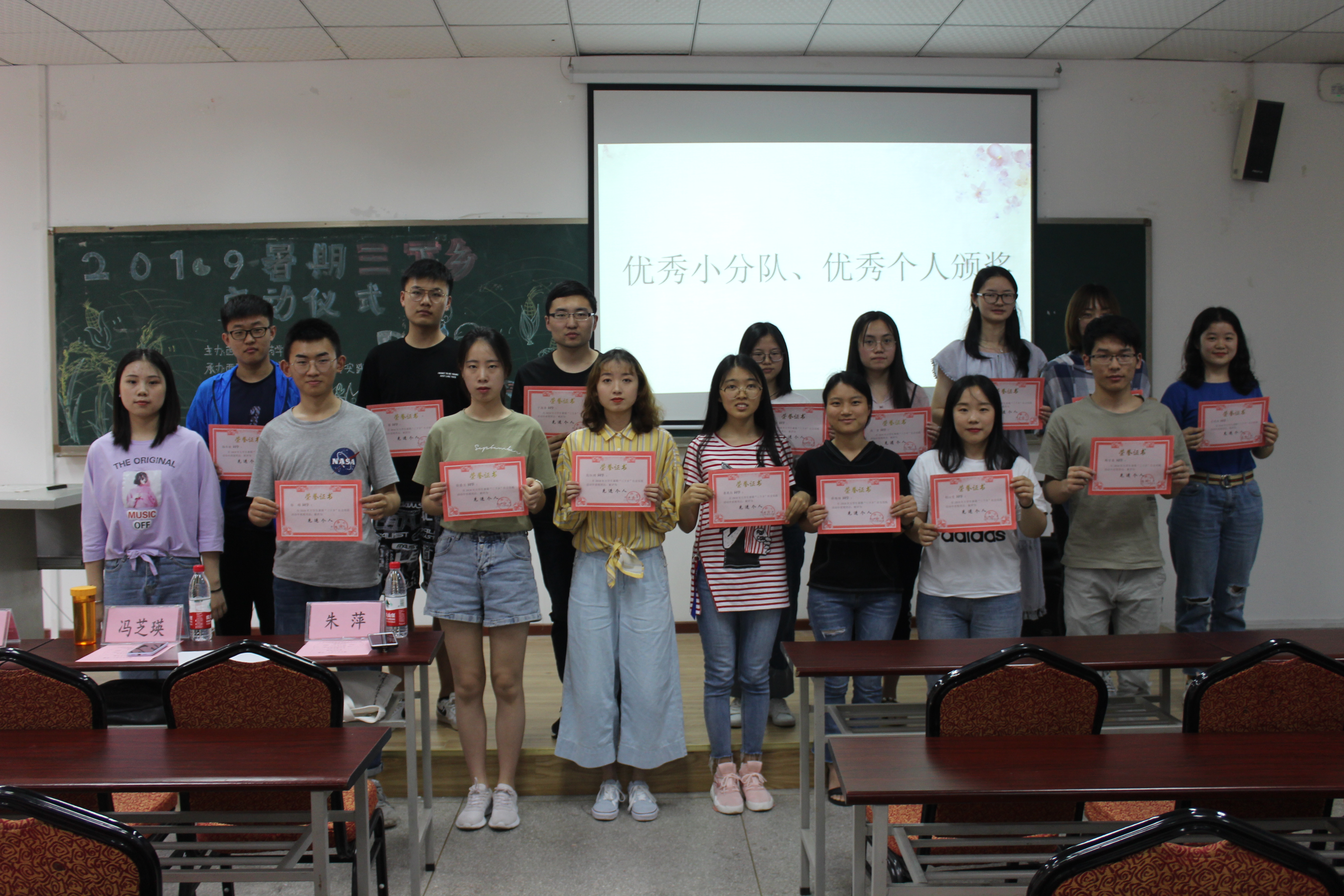 最后,由16级队长冯芝瑛为去年三下乡活动中的优秀小分队及优秀个人颁发了荣誉证书。他们的经历和经验都值得我们去学习。本次活动就在同学们的热烈掌声中圆满结束了。