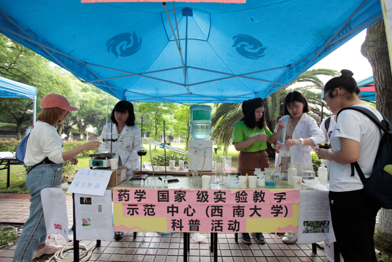 此板块中有六个小版块,分别是香包制作、药饮体验、手绘风筝、知识竞答,实验展示和科普游戏。同学们不仅可以亲手制作香包,绘画风筝,还可以通过知识竞答及科普小游戏获得精美礼品。药饮体验让大家学到了一些常见的可泡茶的药材。在西南大学药学国家级实验教学示范中心科普活动中,现场提取艾草精油的实验引得许多同学驻足观看,拉近了药学实验与大众的距离,使更多的人感受到了实验的乐趣!