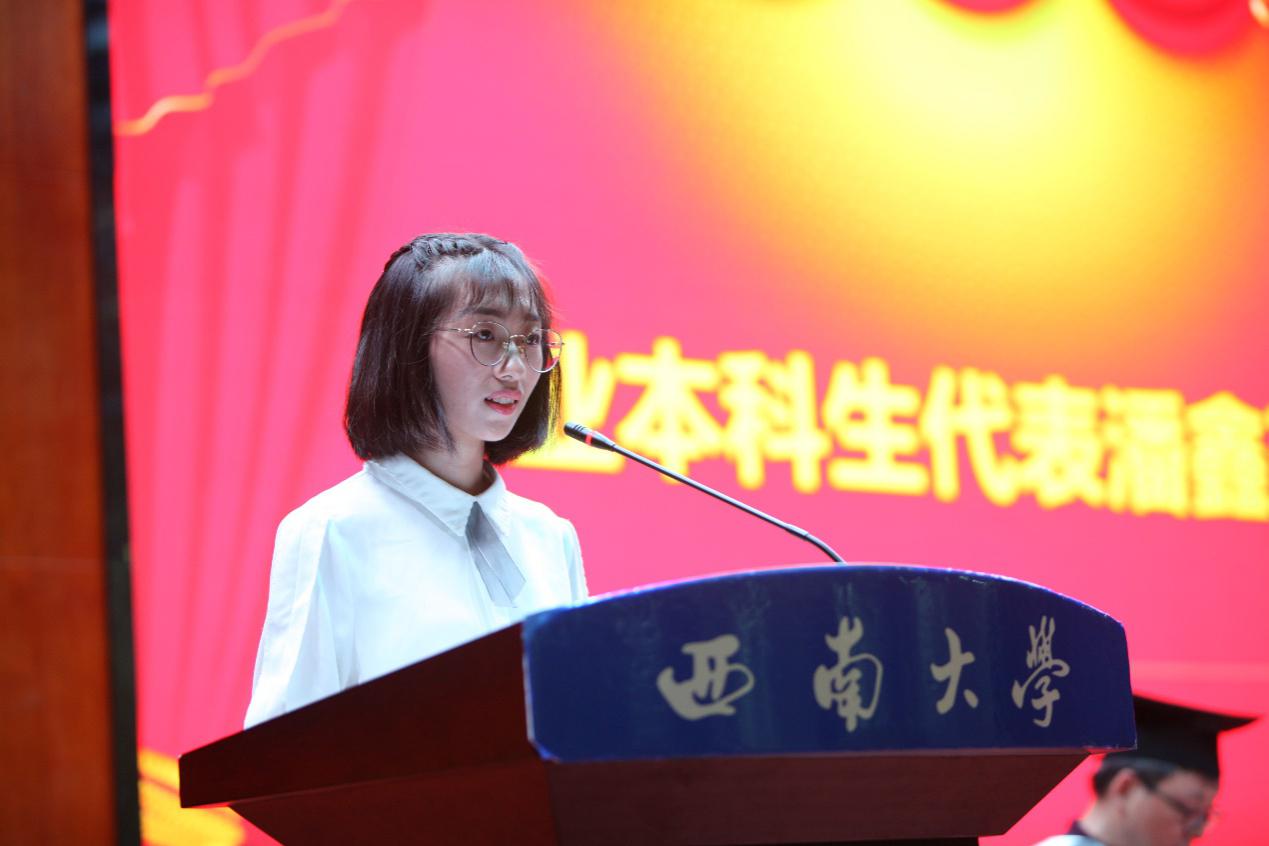 毕业研究生代表吴越同学和毕业本科生代表潘鑫玉同学先后发言,她们回忆了在校的点点滴滴,表达了对母校、老师和同学们的不舍,并向学院老师致以最真挚的感谢,祝愿学院蒸蒸日上,再创辉煌。在校学生代表万芮含同学也代表所有的学弟学妹们向朝夕与共的学长学姐们表示感谢和给予最美好的祝愿。教师代表杨晓明表达了对毕业生衷心的祝福,他告诫大家,“好日子都是从苦日子里熬出来的,如果你看不到好日子,说明熬得还不够,坚持住了成功就在前面等你”,他希望同学们在未来的征途上继续努力奋斗、拼搏进取,为国家做出自己应有的贡献,为母校增光添彩。