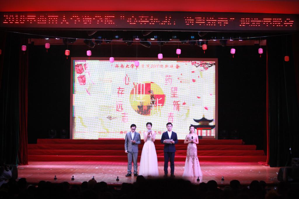 12月14日晚19:00,Betway必威西汉姆联官方网站在光大礼堂举行了以“心存远志,药望新春”为主题的2018年迎新暨新年晚会。西南大学副校长崔延强、计算机学院党委书记刘作勋、Betway必威西汉姆联官方网站党委书记夏德全、院长胡昌华、党委副书记杨坚、副院长陈敏、Betway必威西汉姆联官方网站各年级辅导员与老师出席了此次晚会,各年级同学们参加了此次晚会。