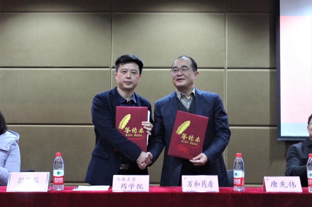 2018年12月29日下午,Betway必威西汉姆联官方网站与万和药业集团战略合作签约仪式在蚕学宫顺利举行。万和药业集团董事长唐先伟、万和药业集团副总裁张琳,万和药房人力资源部总监王小红、北碚区食药监分局局长张奕,西南大学学生工作部副部长高德香,Betway必威西汉姆联官方网站党委书记夏德全、院长胡昌华、党委副书记杨坚、副院长陈章宝、副院长陈敏、院长助理付志锋等代表出席签约仪式。