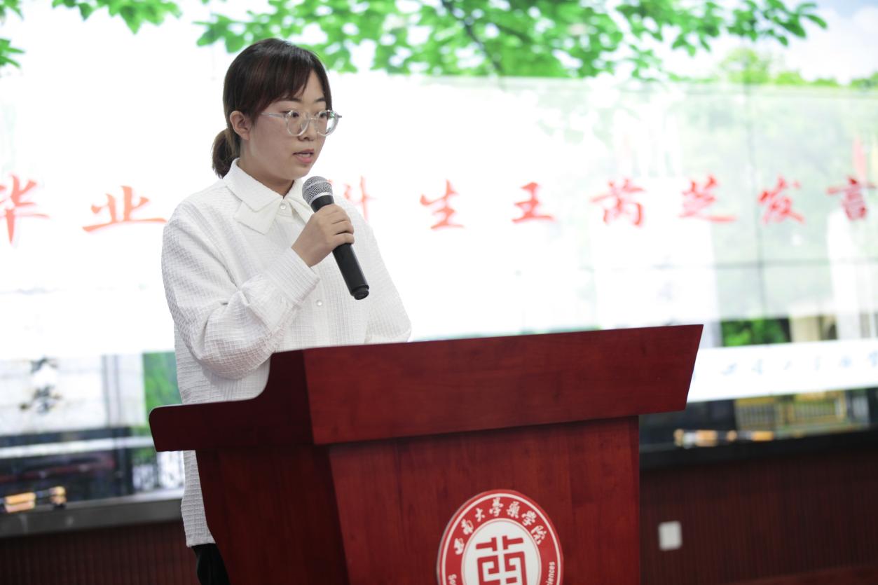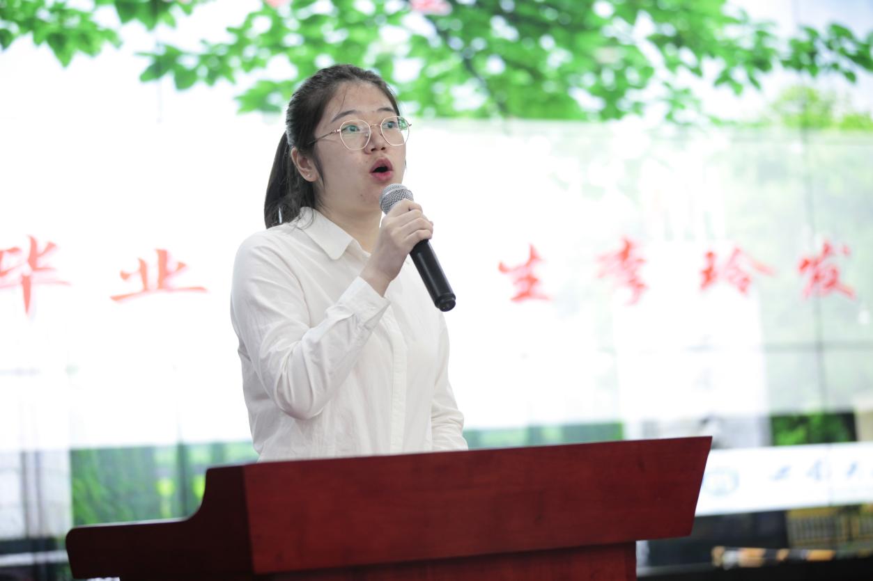 接着2022届毕业本科生代表王芮芝进行了发言。她首先简单回忆了过去三年的时光,同时放眼当下,她认为现在需要为踏实和理智的去为自己规划未来她认为作为毕业生,应该珍惜好大四这一年的实习机会明确自身的定位,提高自己的专业技能,同时也应学会正确分析和评价自己在实践和锻炼中不断提升自己的能力。最后她对每一位准备就业的同学进行了祝福。