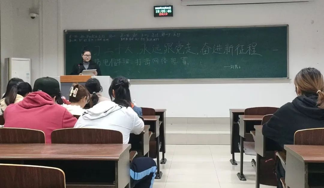 会中介绍了党的二十大相关知识,还介绍了常见的电信网络诈骗类型、普及防范电信网络诈骗的策略并进行了一系列“你画我猜”的趣味游戏进行交流互动。会议强调了党的二十大以实际行动高举中国特色社会主义伟大旗帜的会议精神,呼吁同学们奋力谱写全面建设社会主义现代化国家崭新的篇章。
