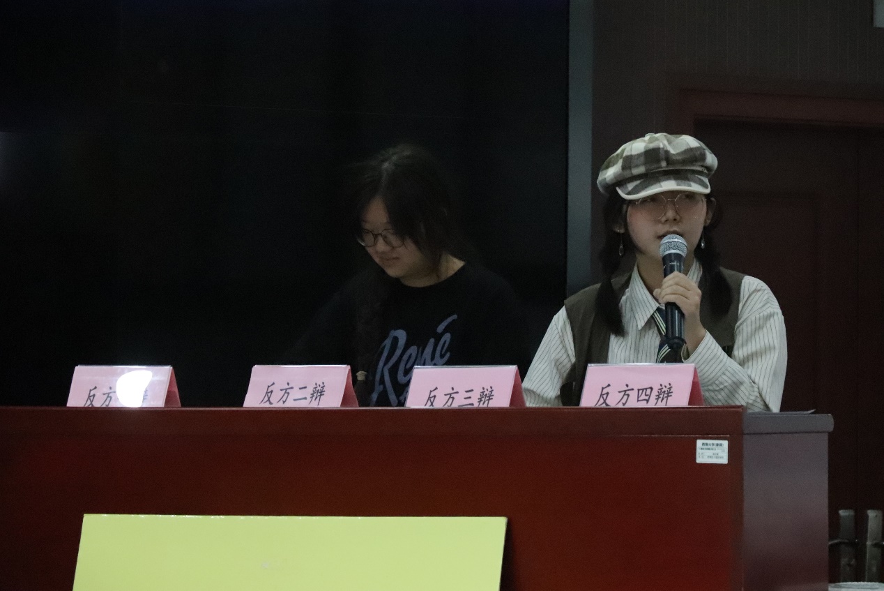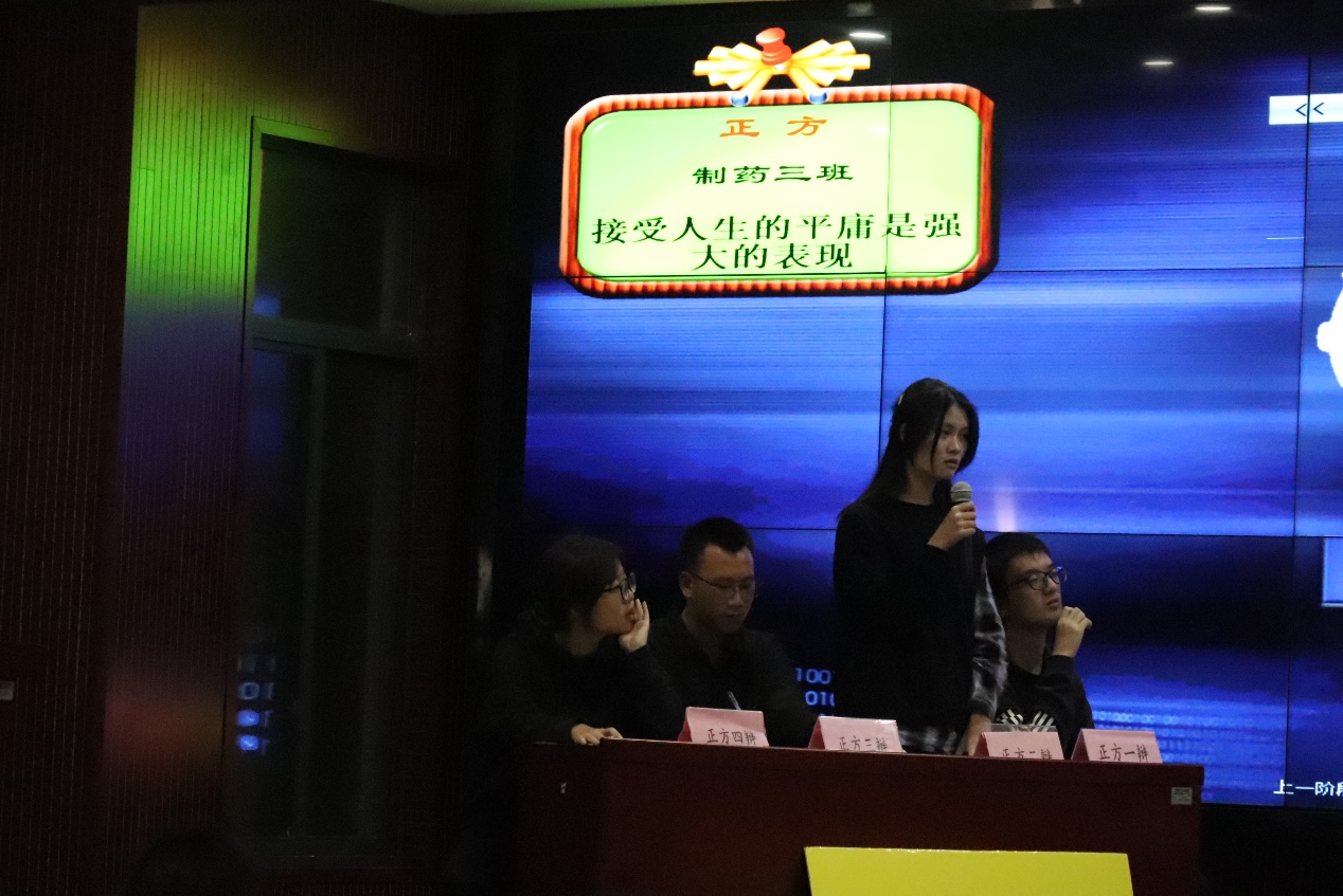 选手们思路清晰,引经据典,字字珠玑,同时穿插人物事例,更显生动贴切,为在场的观众带来了一场精彩的听觉盛宴。双方辩手交替发言,互不相让,立足己方观点,针对对方的漏洞进行反驳,抓住突破口,或一针见血,或循循善诱,一次次将辩论赛推向高潮,双方辩手持理而辩,依据而陈,让观众和评委随其节奏进入了深度的思考中,充分展现了同学们的思辨精神和精神面貌。
