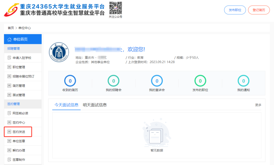 1.登录市教委智慧就业平台:www.cqbys.com,点击“企业登录”,输入账号后进入“单位中心”。没有账号的单位请先注册账号。