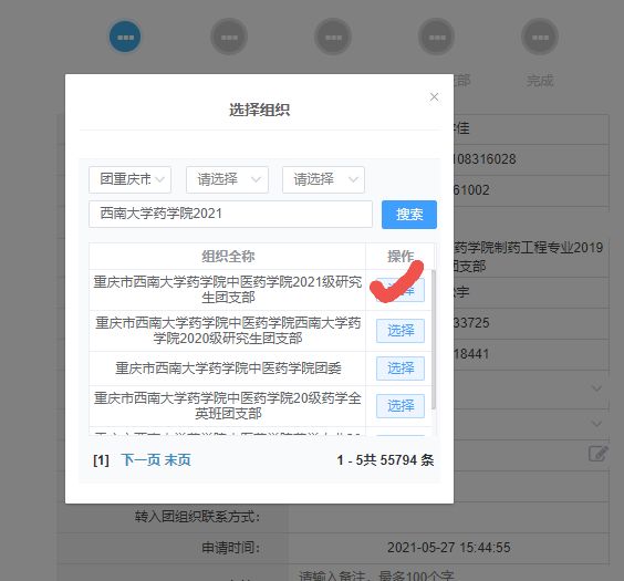 2、请拟录取同学登录“智慧团建”系统,转入团组织选择第1个西南大学Betway必威西汉姆联官方网站中医Betway必威西汉姆联官方网站2021级研究生团支部即可(如下图所示)。