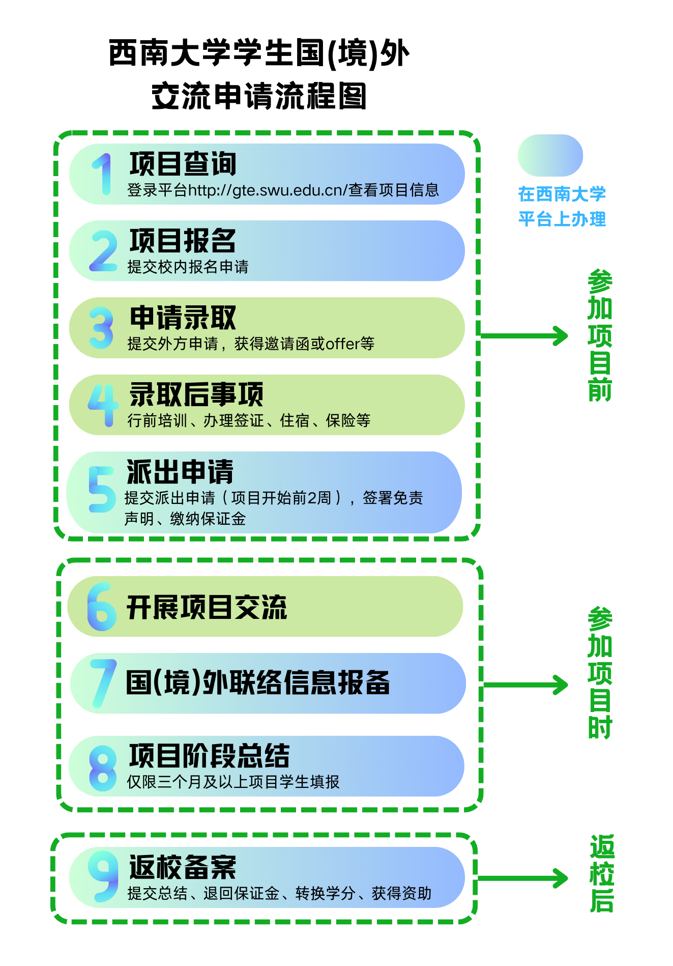2.具体操作指南可登录“学生全球化学习管理服务平台”-文件下载-《西南大学学生国(境)外交流申请流程》查看。