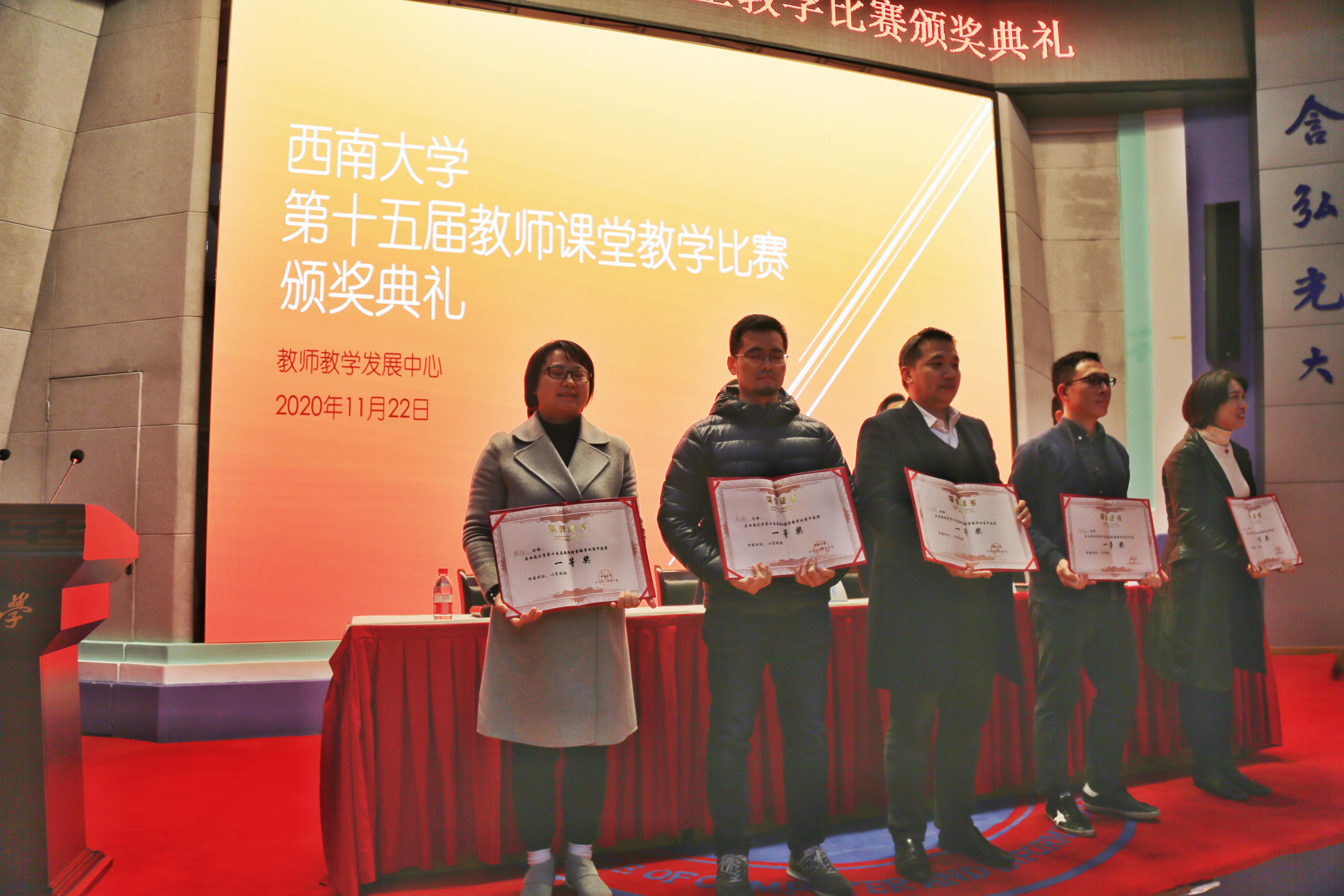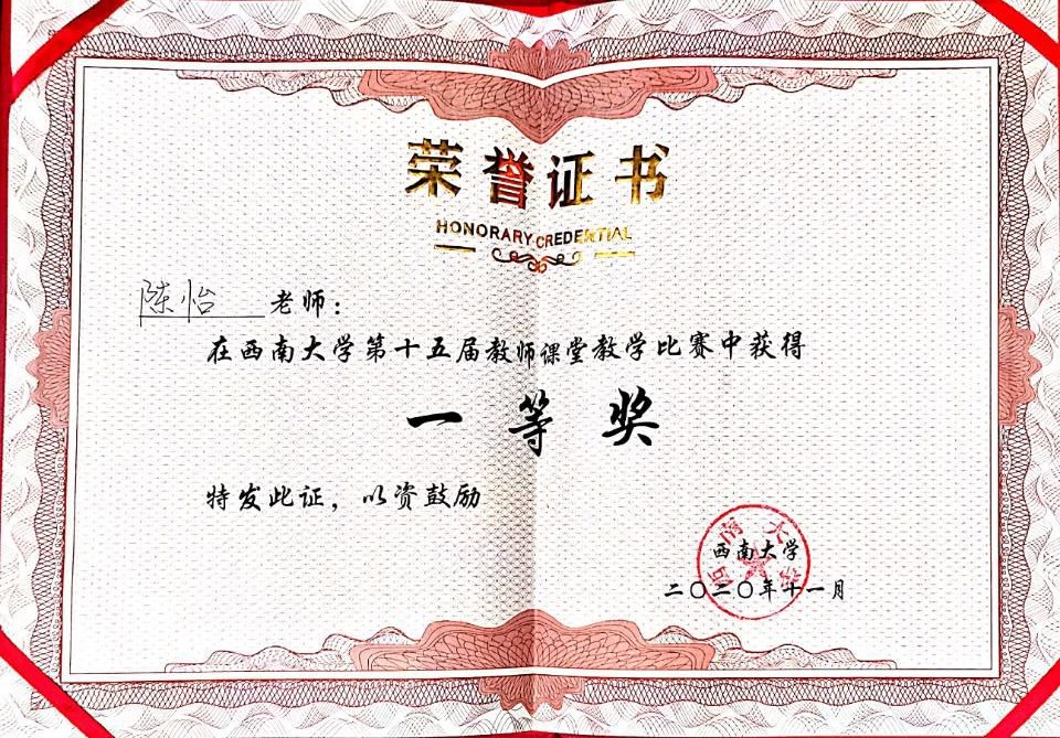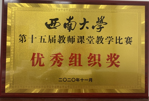 11月22日,由西南大学教师教学发展中心主办的,西南大学第十五届教师课堂教学比赛圆满落下帷幕。本次比赛共设文科两个、理科三个,共五个小组,来自全校34个学院的44名教师参加了比赛,我院陈怡副教授获得一等奖,同时,我院获得优秀组织奖。