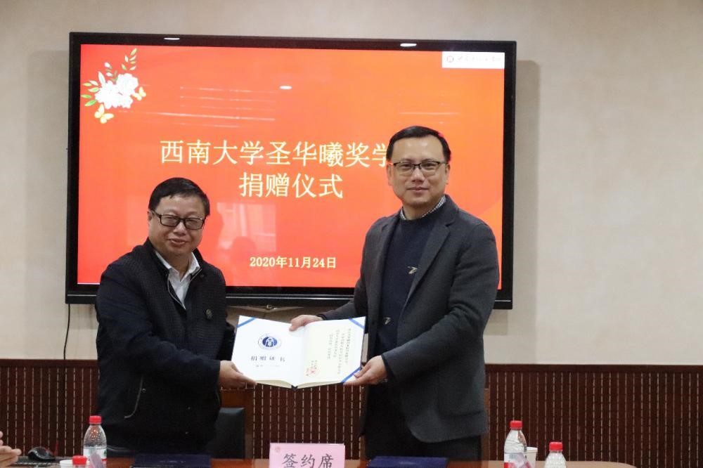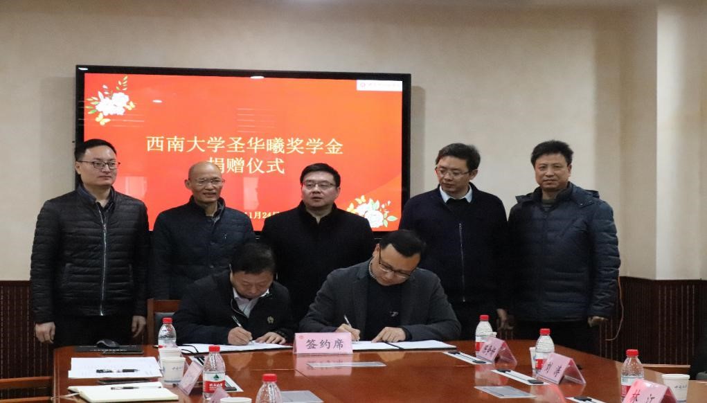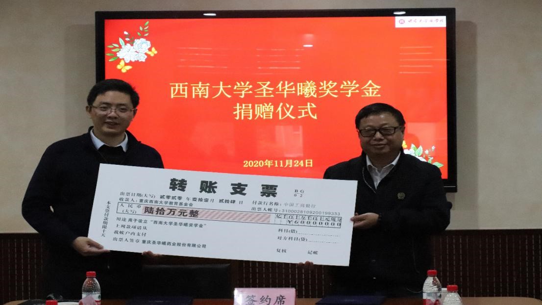 11月24日上午10:00,西南大学“圣华曦奖学金”捐赠仪式在药化大楼238会议室举行。重庆圣华曦药业股份有限公司副总经理林江、总经理助理兼人力资源部经理沈晓静、校对外联络部副部长、教育基金会副秘书长刘涛、Betway必威西汉姆联官方网站党委书记周大明、院长付志锋、化学化工学院党委书记夏德全、院长李念兵、党委副书记张磊等负责人以及获得圣华曦奖学金的学生代表参加了本次捐赠仪式。仪式由周大明主持。