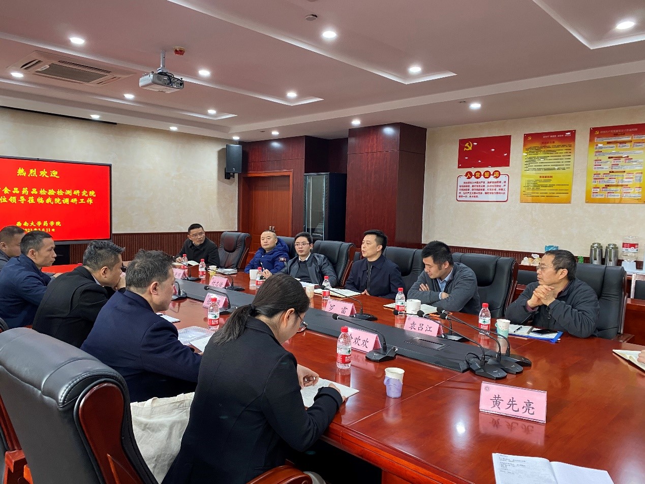 张恩副院长首先对“基地”成立的背景、目的、优势做了详细介绍。并探讨了与学院的合作机制。期望在十四五期间,与学院共同建立区域特色技术研究中心(包括特殊药品质量研究中心、特色中药资源开发研究中心),在项目申报及人才培养加强合作,围绕“基地”人才培养的目标,通过院院合作,推进我院研究生实践能力的培养,同时,实现重庆药监院人才专业技术能力和学位的提升,更好地服务于分析检测任务。