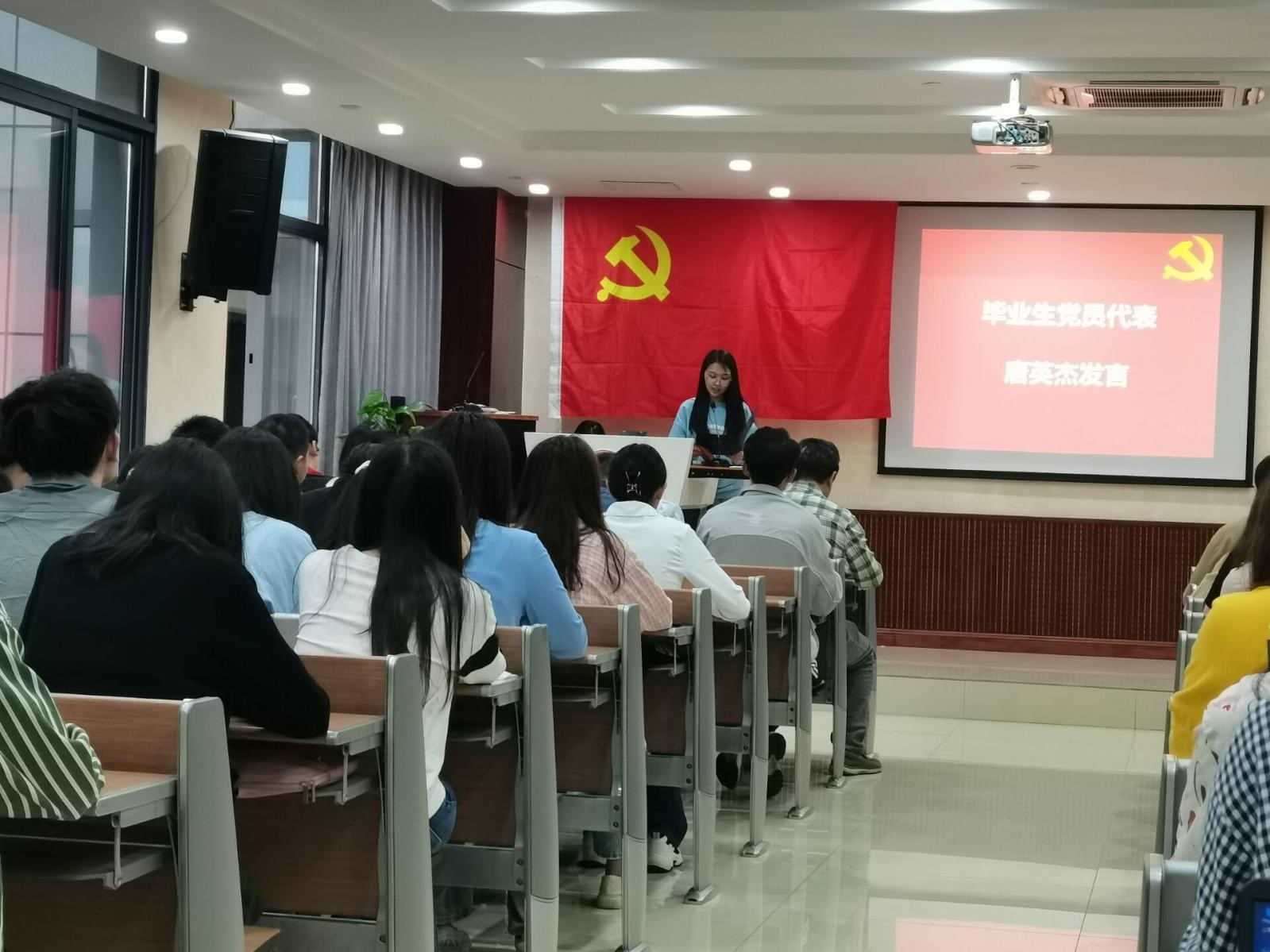 随后,唐英杰同志代表毕业生党员发言,她表示,作为一名共产党员,会牢记含弘光大,继往开来的校训,严格要求自己,扎根基层,奉献自己,努力学习,扎实工作,为祖国建设添砖加瓦。