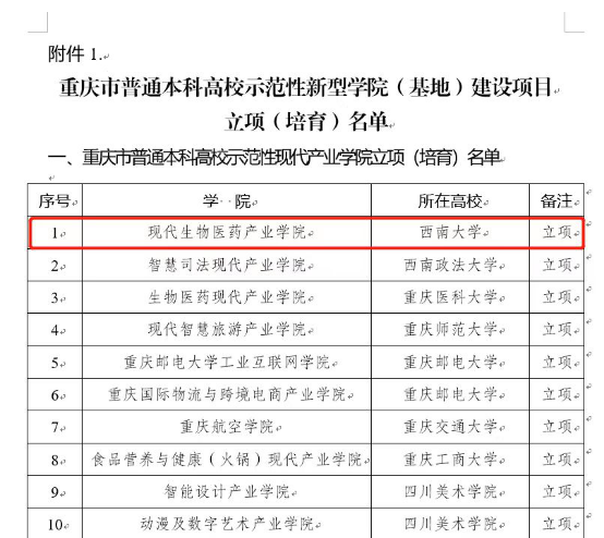 近日,重庆市教育委员会发文(渝教高发〔2021〕17号)立项建设西南大学现代生物医药产业学院等示范性现代产业学院。这是我院在制药工程专业获批建设国家一流专业建设点后,再次获得一项推进专业人才培养的重要支撑平台。