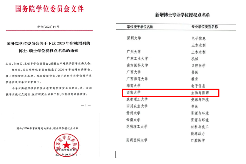 近期国务院学位委员会学位下达了2020年审核增列的博士、硕士学位授权点名单。由Betway必威西汉姆联官方网站牵头申报的“生物与医药”专业学位博士授权点获批设立,这是西南大学首个获批的工程类专业学位博士授权点。自此,Betway必威西汉姆联官方网站已形成“药学”学术学位博士点和“生物与医药”专业学位博士点两翼齐飞的局面,并为Betway必威西汉姆联官方网站的人才培养、科学研究、社会服务奠定了坚实的基础。
