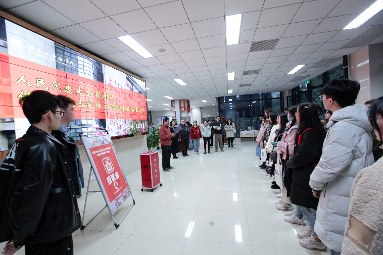 12月8号,是重庆市北碚区西南大学第十九届人大代表换届选举投票日。上午8时,投票站选举仪式在学院党委书记周大明同志的主持下进行,首先主持人宣读了本选区正式代表候选人名单及《重庆市北碚区第十九届人民代表大会代表投票选举办法》,随后监票人检查票箱并加封条,工作人员就位,选举工作正式开始。