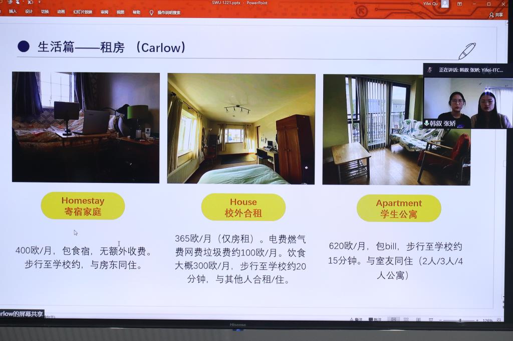 本次交流学习会邀请了2016级本科药学专业毕业生韩叙和张娇从衣、食、住、行等方面分享了出国留学生活,并介绍了新冠疫情下的留学生活,进而鼓励学弟学妹们勇于挑战自我,走出舒适圈。