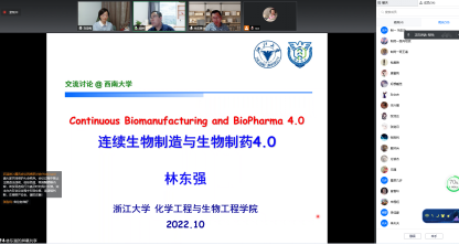邹祥教授首先代表教研室发言,介绍了虚拟教研室的建设情况、系列化教研活动的开展,并代表教研室对林东强教授的交流和报告表示欢迎。随后,林教授从生物药物的发展现状及面临的挑战出发,详细介绍了在生物制药制造的复杂流程中,如何开展连续化、数字化、智能化生产。林教授谈到:制药行业是个复杂的系统工程,要提高中国生物制药行业整体的竞争力,不仅在创新药物上,更要在创新工艺上。连续化、数字化、智能化生产是制药行业的发展趋势。通过数字化表征实体物理世界的数字孪生,是进一步实现智能化的桥梁。他鼓励同学们,学好专业课的同时,提前做好准备,使自己成为既懂得生物制药工艺,又具有数字化和智能化的专业复合型人才。最后,林教授与虚拟教研室老师们交流了自己的科研经历,引导青年教师在未来的科研发展之路中坚守耕耘,积极与企业合作,开创和引领科技前沿。