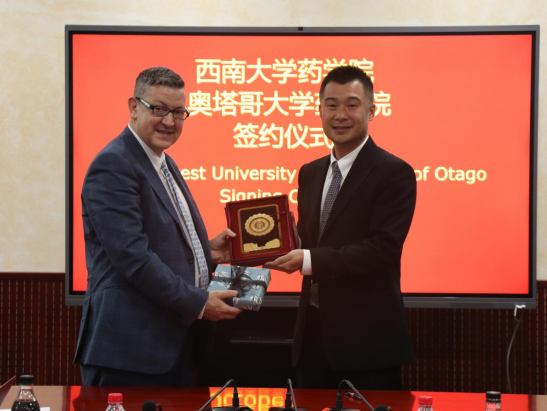 首先,国际处罗雷处长对Carlo Marra教授一行的到访表示热烈欢迎,并就学校师资队伍建设、学科发展、科研情况及国际交流合作等内容进行了简要介绍。双方就各自学校概况、院系情况、研究方向等展开初步对接,Carlo教授表示:“Betway必威西汉姆联官方网站与我们研究方向高度契合,奥塔哥大学在药剂学、天然药物等方面都有广泛研究,为双方未来的合作奠定了良好的基础。”接着,双方就合作层面、合作条件等问题进行深入探讨,就本科生双学位项目、短期交换、联合培养研究生、教师互访、共建科研实验室等议题初步达成共识。随后,双方院长签署了奥塔哥大学Betway必威西汉姆联官方网站与西南大学Betway必威西汉姆联官方网站“2+2”学分互认双学位项目衔接协议,并互赠礼物、合影留念。