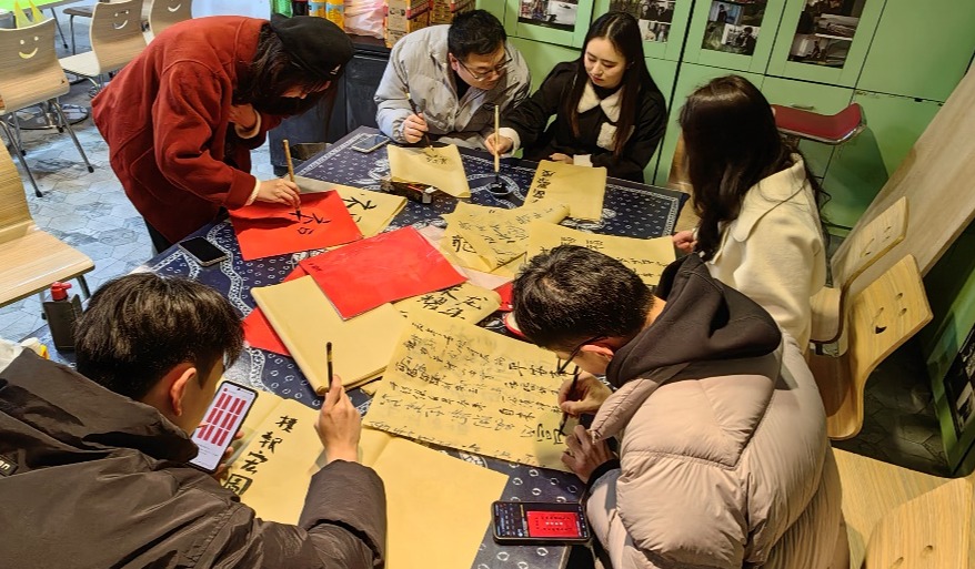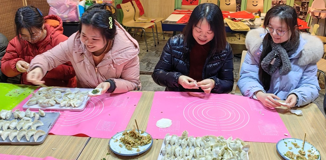 联谊会现场一派热闹喜庆的节日气氛,处处洋溢着大家的欢声笑语。同学们挥毫泼墨,各展风采,把对新春的美好祝愿留在了一幅幅对联上。在包饺子环节,大家更是各显身手,分工明确,忙的不亦乐乎,把喜庆和进馅儿里,把祝福包进皮儿里,期待未来的生活像圆溜溜的饺子一样团圆美满、平安如意!