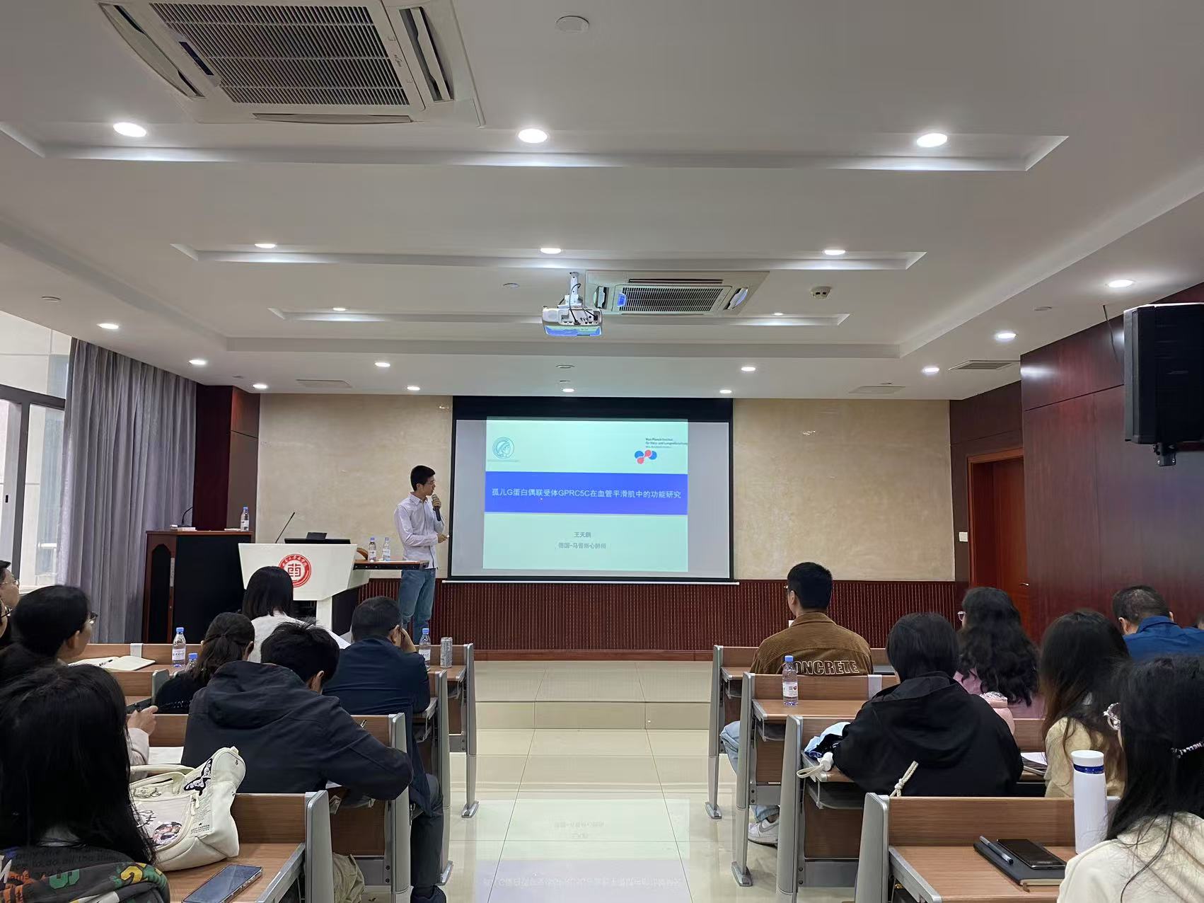 随后,王天鹏博士以“孤儿G蛋白偶联受体GPRC5C在血管平滑肌细胞中的功能研究”为题作了学术报告。报告主要介绍了他和Nina Wettschureck等人在《Circulation Research》上发表的研究,首次揭示了孤儿受体GPRC5C在血管平滑肌中的作用。研究通过条件敲除技术发现,缺少GPRC5C基因的小鼠在血管紧张素II诱导的收缩反应中表现出显著降低,并对高血压病理条件展现出更强的抵抗力。机制研究表明,GPRC5C与Ang II受体(AT1R)的相互作用是调节信号传导的关键。主要结论是GPRC5C通过与AT1R形成二聚体来调节信号传导,研究意义在于为高血压治疗提供了新途径和潜在靶点。