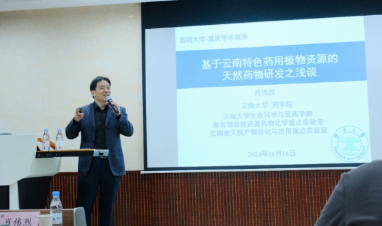 11月16日云南大学Betway必威西汉姆联官方网站肖伟烈教授以“基于云南特色药用植物资源的天然药物研发之浅谈”为主题,向大家介绍了“天然产物对人类健康事业的作用”、“天然产物对药物设计的启发”、“天然药物化学研究瓶颈难点及应对策略”等内容,并详细介绍了自己团队在云南特色药用植物资源方面的研究成果。