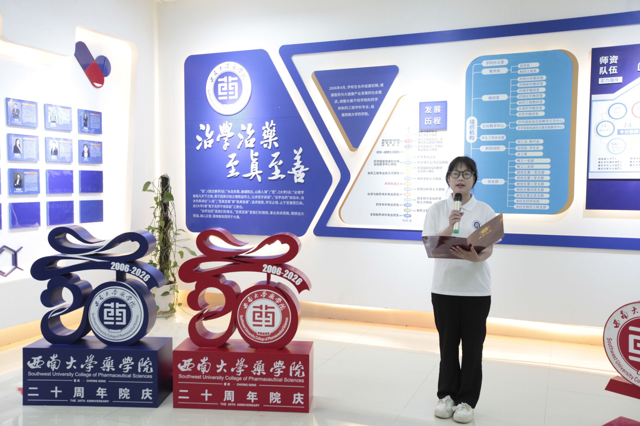 随后,学院2021级制药工程专业本科生马叶青作为在校生代表进行发言,她以青春视角表达了对学院的热爱。她指出作为新一代的药院人,同学们既是学院发展的见证者,更是未来的创造者。在不远的未来,同学们将以“二十而新”的姿态,在科研攻坚、服务社会中践行药院人的使命。
