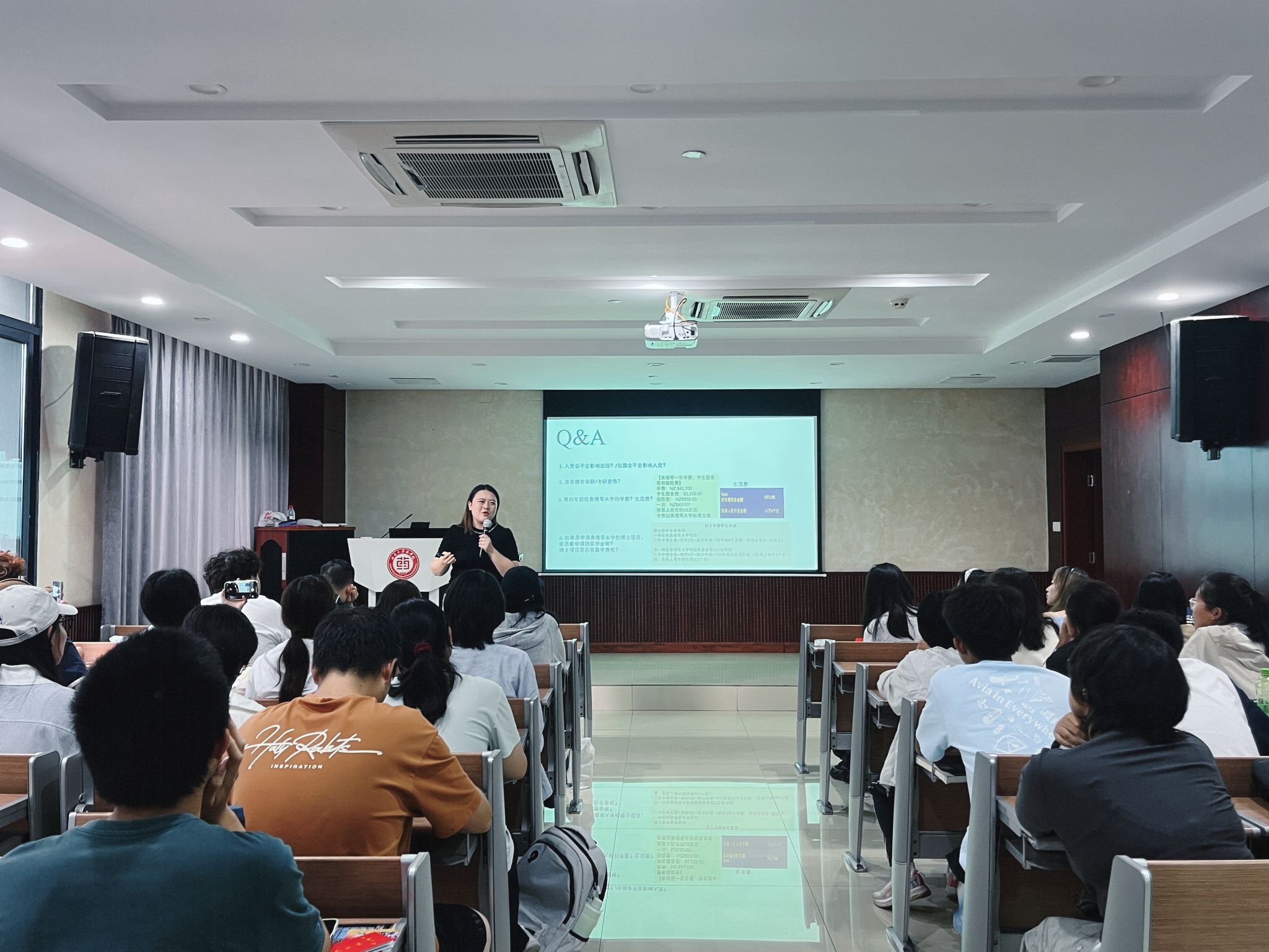 讲座伊始,冯然然老师围绕西南大学与新西兰奥塔哥大学联合培养项目展开立体化解读。重点阐释"双学位联合培养"机制,通过对比分析两校课程体系,详细拆解特色课程模块与海外学习路径。现场播放的奥塔哥大学实验室实景影像、学术交流纪实等素材,配合冯老师分享的海外研学见闻,生动呈现了跨文化学习场景。冯老师详细解答了学生关切的海外升学就业等问题。