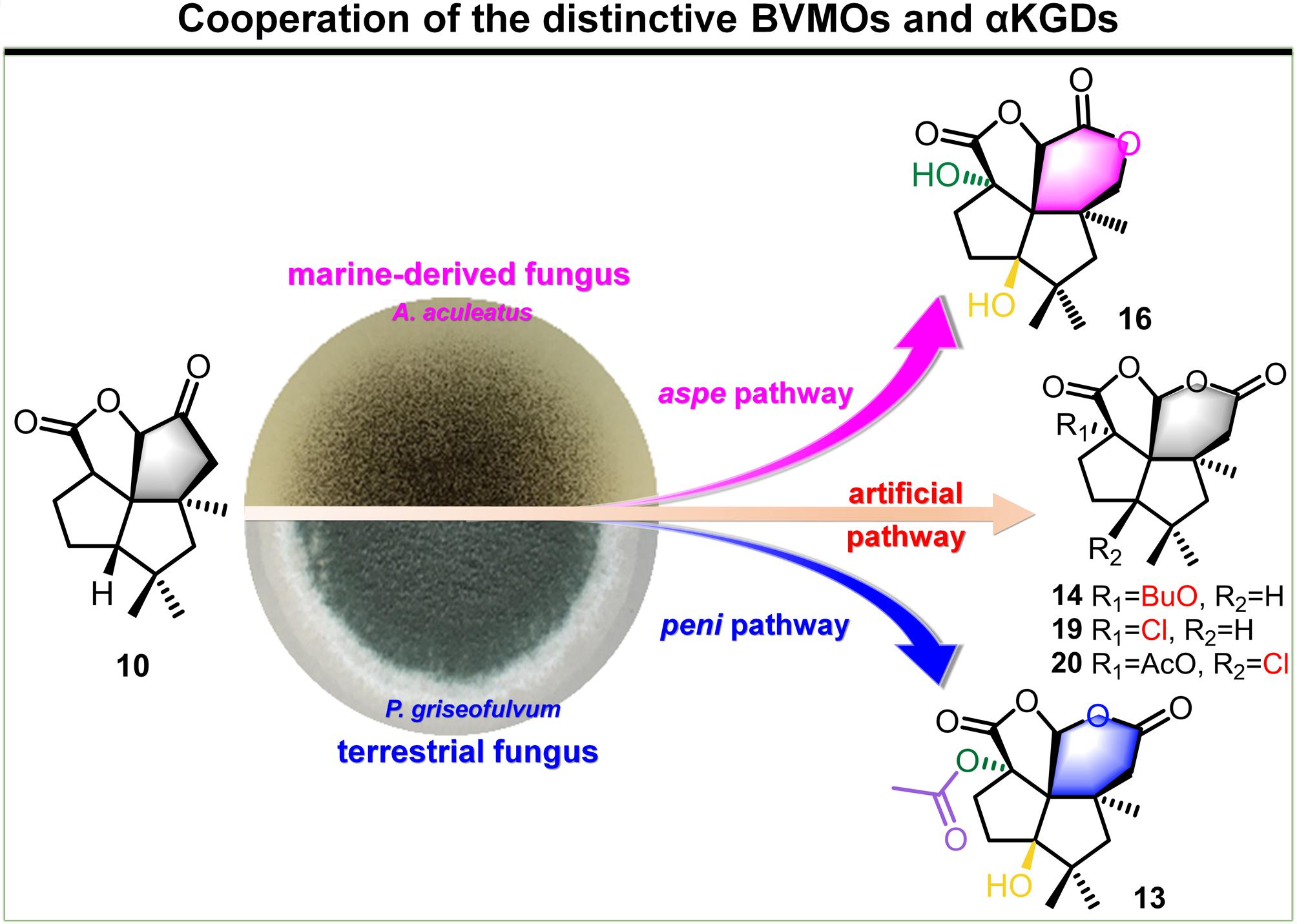 该课题组,在前期关于[5.5.5.6]-氧化型窗烷环倍半萜骨架酶学合成(Angew. Chem. Int. Ed. 2019, 58, 6569-6573)的研究基础上,采用基于序列网络分析的基因组挖掘策略,通过异源生物合成、化学喂养、基因敲除、酶法合成结合代谢工程改造等多学科交叉方法和策略,(1)在海洋真菌Aspergillus aculeatus的基因组中发现了asperaculin类窗烷环倍半萜生物合成基因簇,并在模式菌株构巢曲霉中异源重构了其完整生物合成途径。发现其与陆生真菌来源的penifulvin类窗烷环倍半萜在合成途径(peni和aspe)上共用同一前体,但在药效官能团δ-内酯环的形成过程中,分别由处于不同进化分支的Baeyer-Villiger氧化酶(PeniC和AspeB)催化不同位置选择性的插氧反应。其中AspeB是来自于海洋真菌的全新Baeyer-Villiger氧化酶;(2)在peni和aspe途径中发现具有底物宽泛性的α-KG依赖的双加氧酶(a-KGDs)AspeC/D和PeniD/F能高效地对氧化型窗烷环倍半萜骨架的惰性C-H键进行位置选择性和立体选择性的氧化反应,生成窗烷环倍半萜的氧化衍生物库;(3)通过对a-KGDs进行理性设计,采用定点突变技术,将a-KGD转化为卤代酶,创造性地在氧化型窗烷环倍半萜惰性碳骨架上引入了氯代修饰,从而极大地扩展了窗烷环倍半萜类化合物的结构多样性与复杂性。