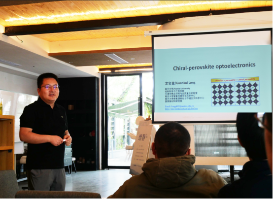 报告中,龙官奎研究员对手性有机-无机杂化钙钛矿展开了详细的讲解,围绕着手性钙钛矿材料的发现发展,手性钙钛矿材料的特殊性能,对手性钙钛矿材料的设计思路,目前设计的实验以及实验结果,已经取得的一些成果以及对未来的一些展望等方面展开。与会的师生与龙官奎老师就手性有机-无机杂化钙钛矿的相关科学问题进行了积极的讨论。