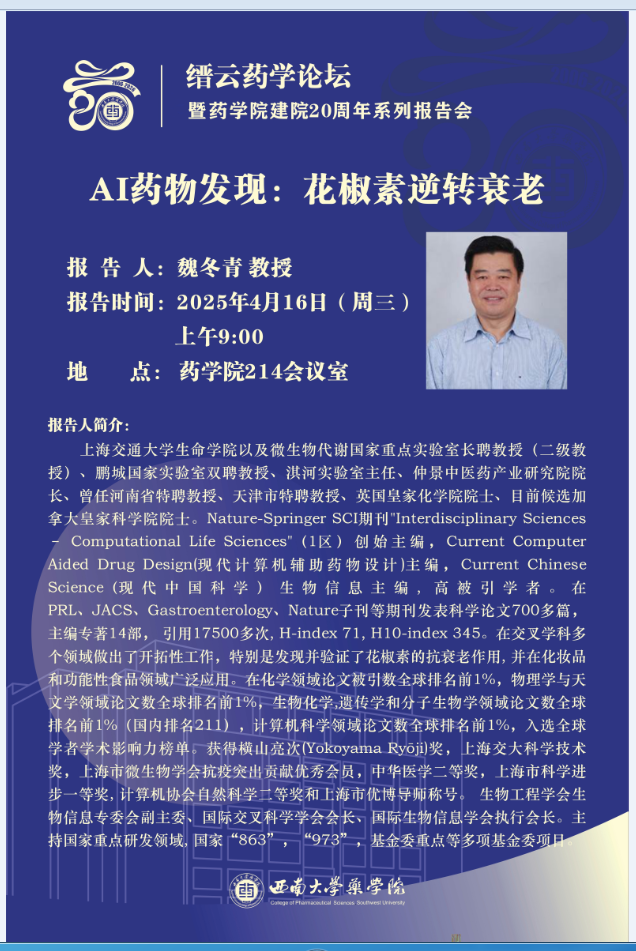 缙云药学论坛暨Betway必威西汉姆联官方网站建院20周年系列报告会(十一):魏冬青教授学术报告