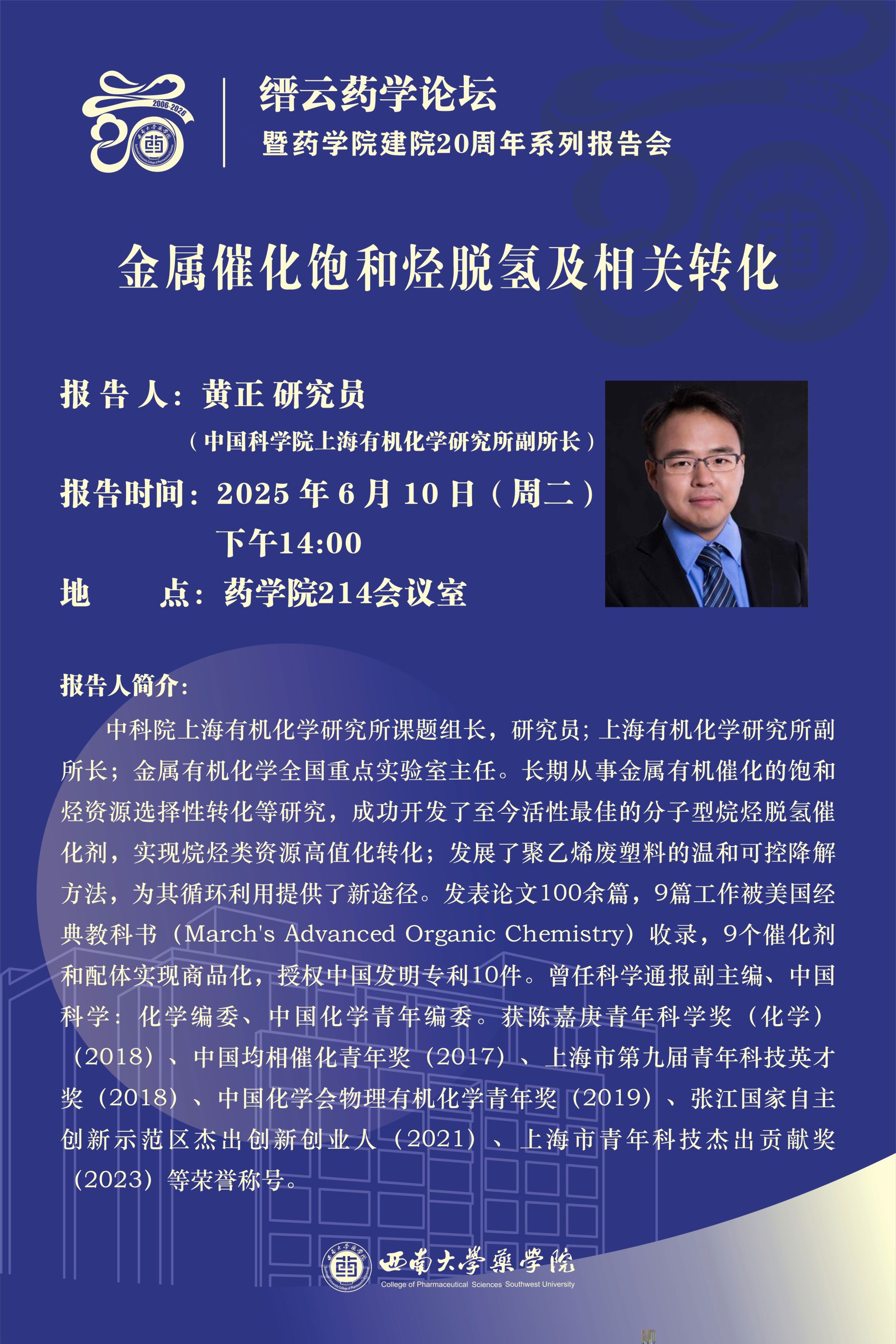 缙云药学论坛暨Betway必威西汉姆联官方网站建院20周年系列报告会(十八):黄正研究员学术报告