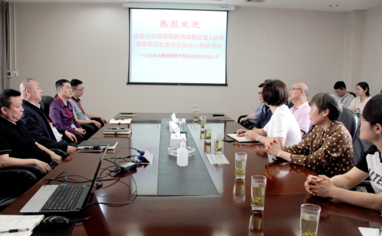 在大新药业,双方进行了深入的座谈交流。药厂专家介绍了企业的发展历程,分享了药品研发的最新进展和市场趋势,以及企业在技术创新和人才培养方面的经验。教师们介绍了实验中心的基本情况以及药剂学教研室的科研方向,并就如何加强校企合作、推动产学研深度融合等问题与药厂专家进行了热烈讨论。
